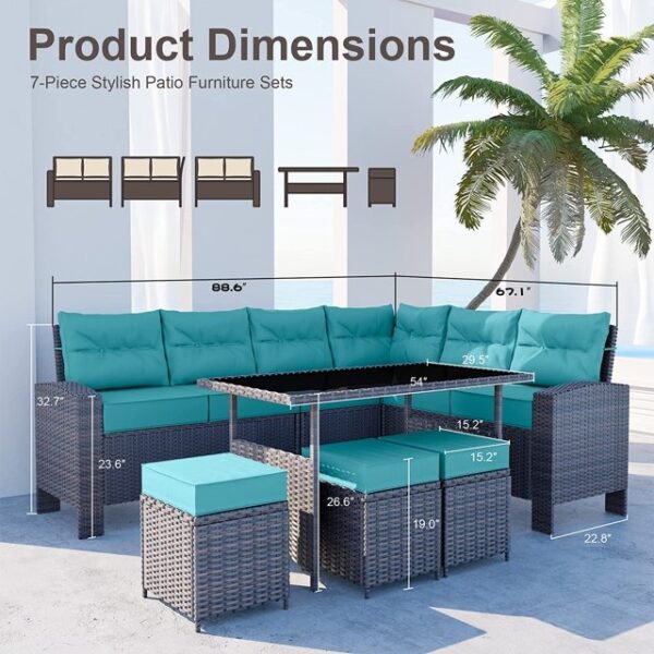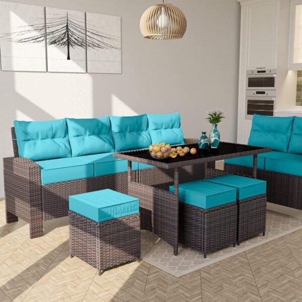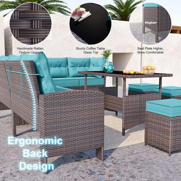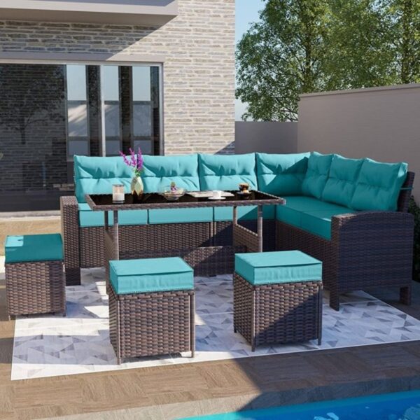 OMCCO 6PCS L-Shape Patio Rattan Dining Set Cushioned Chairs Ottoman Tempard Glass Table Top Outdoor Dining Table for Porch Lawn Garden Backyard. (Dark Brown and Sky Blue Color)
